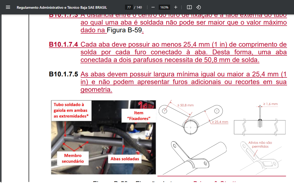 Minha dúvida é a respeito do item B10.1.7.5 que indica as dimensões máximas para o olhal do tanque de combustível, não deixa explicitado se ambos olhais para o tanque de combustível Briggs precisam estar das dimensões indicadas de 1'' de largura e 2'' de distância do centro do furo ao tubo de fixação. Neste caso, a angulação disponível torna-se limitada para se aplicar a calha que de derramamento. Estas dimensões restringem-se apenas ao olhal mais próximo ao SHC ou a ambos olhais?
