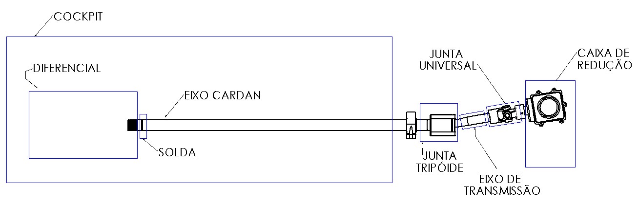 O questionamento é referente a utilização de um sistema com dois eixos, um eixo cardan e um eixo de transmissão (responsável pela conexão do cardan a caixa de redução), na figura abaixo o eixo cardan possui uma seção sem conexões medida conforme dimensões citadas anteriormente ultrapassando o plano RRH que delimita o cockpit. O eixo de transmissão conecta-se ao cardan por meio de um junta tripoide e a caixa de redução por uma junta universal. Nesta perspectiva, gostaria de saber se o projeto apresentado abaixo é valido ou se configura como um cardan seccionado. Além disso, gostaria de saber se os anteparos de ambos eixos devem se atender a todos os requisitos apresentados no informativo