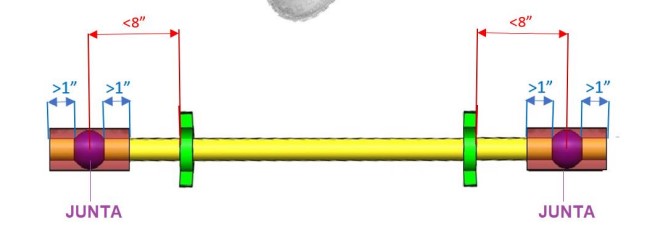 "Todas as juntas universais, acoplamentos, flanges, articulações, juntas homocinéticas, ou similares, devem ser protegidas com anteparos que atendam às exigências de resistência conforme descrito na seção B13.1.5 e devem se estender1”(25,4mm) além da medida das juntas (vide Figura 04). Os anteparos devem ser fixados por parafusos ou soldas diretamente à gaiola, e não devem ser fixadas às caixas de redução, caixas de transferências ou caixas de diferencial."