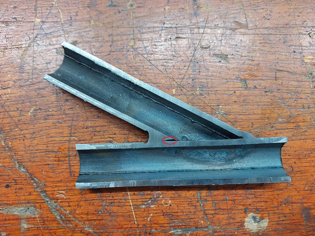 Onde está circulado em vermelho eu não consigo chegar com a solda (já tentei soldar com MIG/MAG e TIG), porém dá para observar que o material que adicionei na solda funde em ambos os tubos, fica apenas esse espaço no canto inferior.
