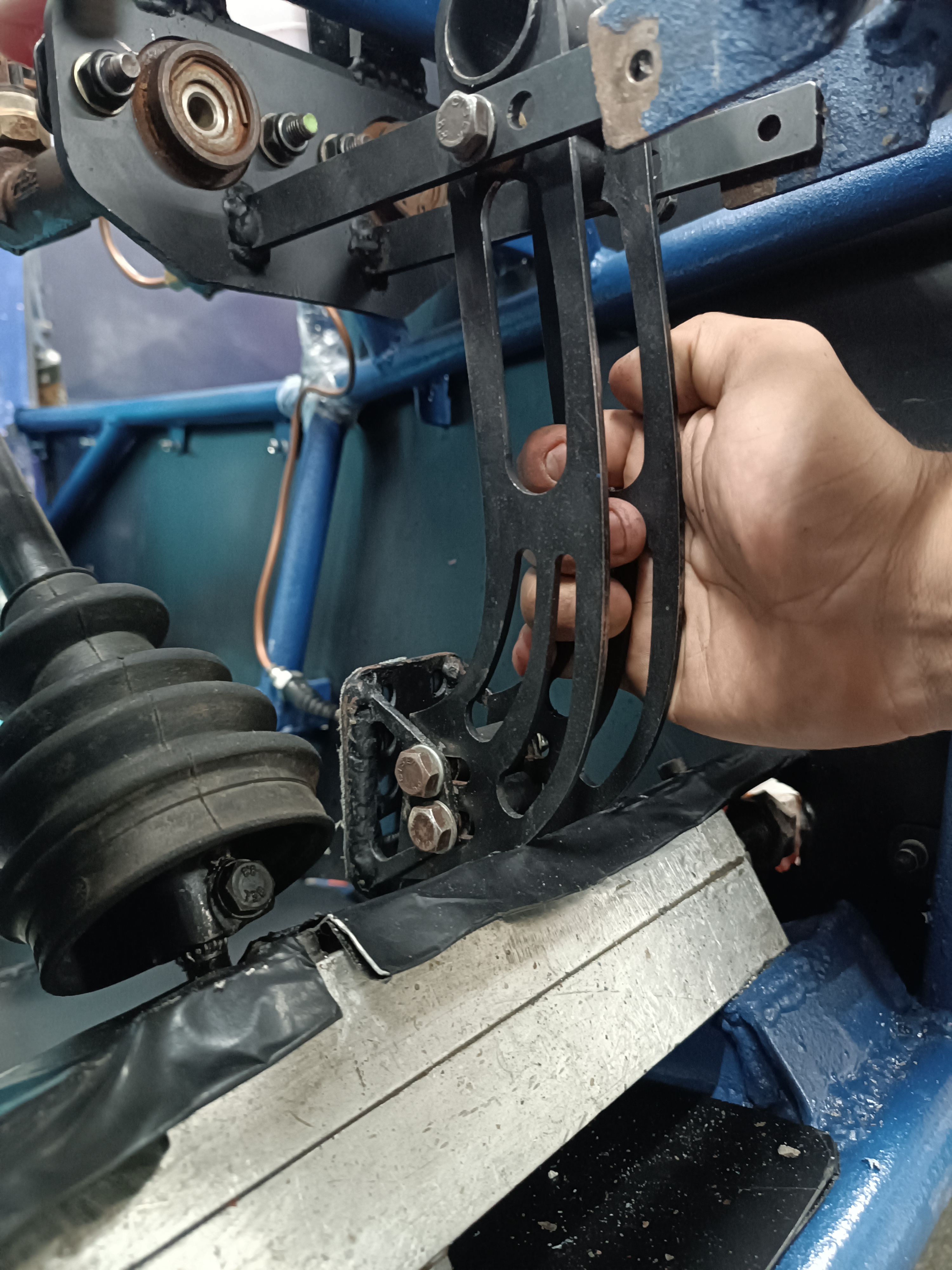 Nas fotos a seguir e possível ver que a caixa de direção agulada limita o curso do pedal em caso de perda do freio e no regulamento só pede que o pé do piloto não saia pela frente do cockipit em caso de falha no freio. Neste caso, a caixa de direção seria considerada um batente? Levando em conta que no acionamento normal do pedal, não tem contato com o batente, apenas sem pressão.