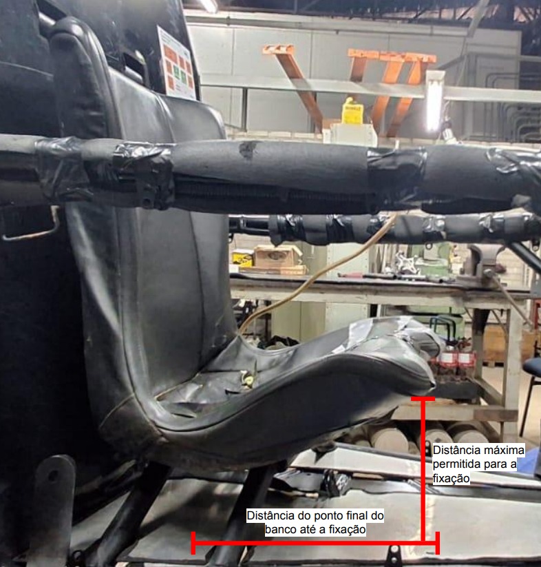 Durante a ICTS, nosso time recebeu um recheck relacionado à fixação do banco tipo concha do carro. Apesar de o banco estar fixado, a parte dianteira apresentava certa maleabilidade, o que levou o comitê a interpretar a fixação como insegura — principalmente por estar visivelmente elevada em relação ao assoalho.