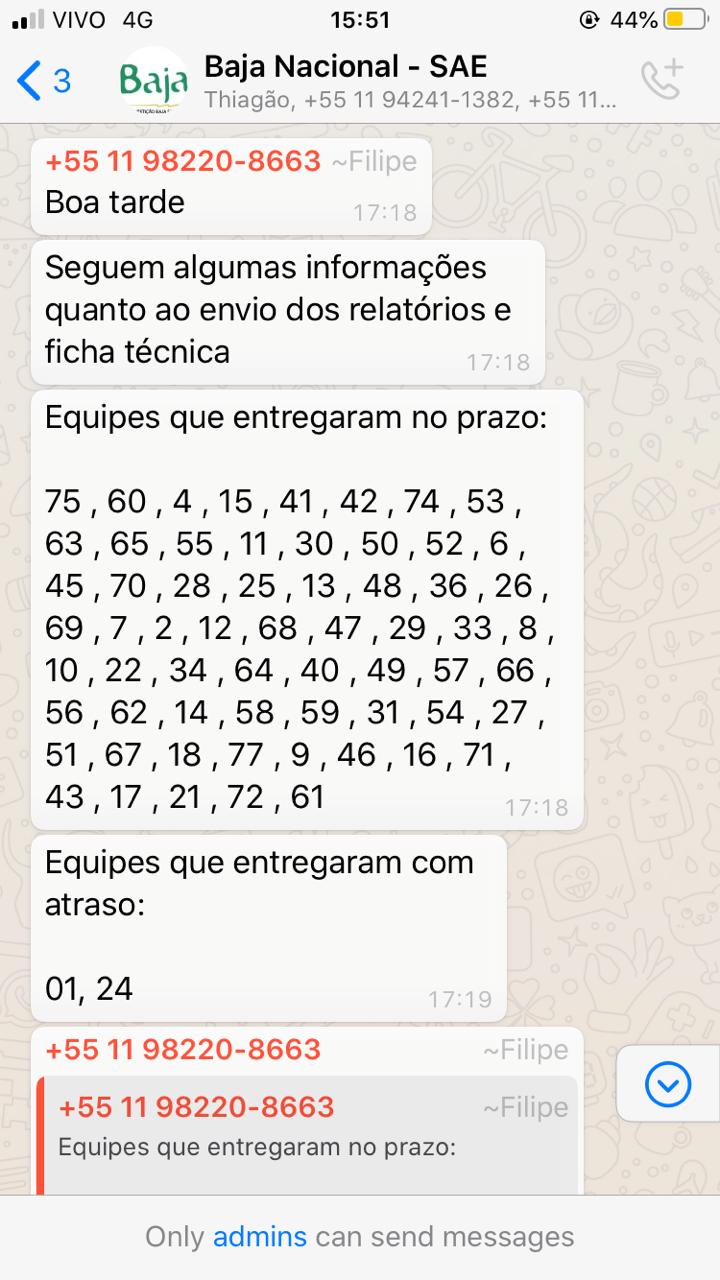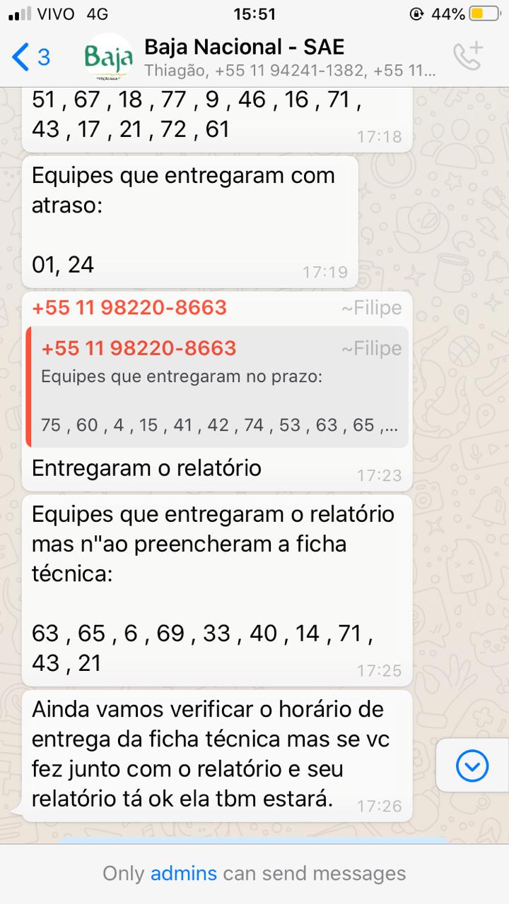 Em anexo seguem os prints que comprovam que estávamos dentro do horário para realizar a entrega da ficha técnica e também mais dois prints do grupo no WhatsApp com os capitães que mostram que também não atrasamos no envio.