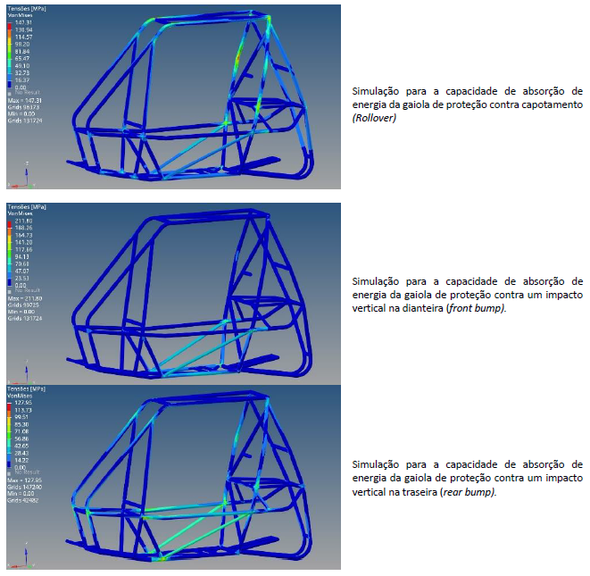 Através simulações computacionais de rollover, front bump e rear bump é possível afirmar que a gaiola de proteção atual é segura, pois todas as simulações ficaram abaixo da tensão admissível. Além disso, é importante ressaltar que o travamento dianteiro entre os pontos denominados S e I, possui um papel importante para a segurança e integridade da gaiola.