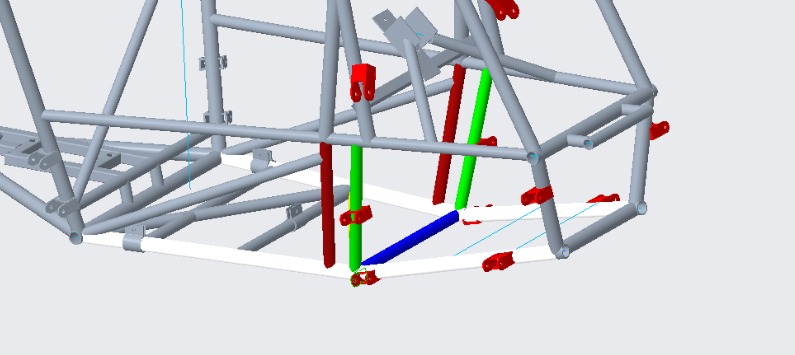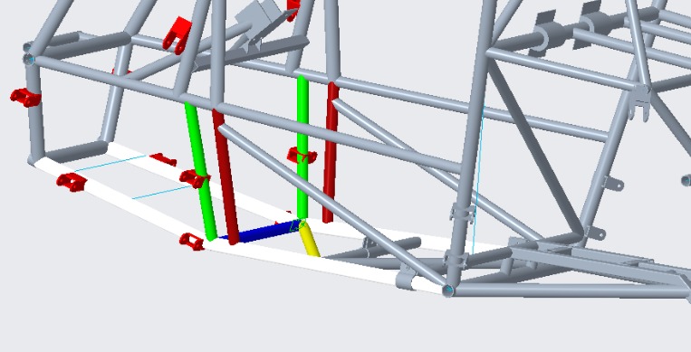 Nessa lógica, a dúvida que venho sanar é que o nosso ILC (tubo em azul) está localizado no ponto de mudança de plano do LFS, além de estar localizado a menos de 51 mm (2in) de distância do ponto de ancoragem traseiro dos braços inferiores da suspensão dianteira, definindo neste local os pontos IR e IL. Tais pontos estão coincidentes com o Travamento Vertical (tubo verde), em que estão localizados os pontos de ancoragem traseiro dos braços superiores da suspensão dianteira. Outrossim, o tubo LFDB (tubo amarelo) está coincidente com nosso ponto IR. Entretanto, na etapa nacional de 2022, durante a inspeção de segurança, a interpretação dos juízes divergiu sobre este tema, em que alguns afirmaram que nosso chassi estava dentro dos padrões exigidos e outros questionaram que o nosso tubo ILC não estava coincidente com os tubos FAB low (tubos em vermelho), mas, no regulamento, em momento algum encontramos tal fato externado pelos juízes em negação. Portanto, qual linha de pensamento podemos nos nortear, tendo em vista que nosso carro foi aprovado na inspeção de segurança do nacional 2022?