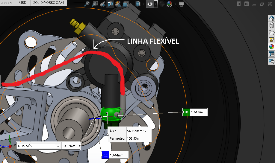 Gostaria de saber se teríamos problemas com o posicionamento da pinça nas imagens anexadas, que representa a montagem do montante traseiro esquerdo, e com a saída do flexível assim como sua passagem. Usamos swing axle para suspensão tarseira e dessa forma a linha flexível sairia pelo olhal com 90º de inclinação, como mostrado nos anexos, contornaria por cima o semi eixo e em seguida a linha seria fixada ao longo do semi arrastado da suspensão até chegar na parede corta fogo.
