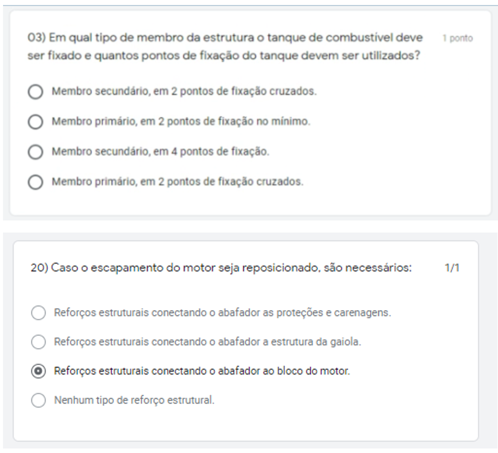 Como visto, a questão pergunta: “Em qual tipo de membro da estrutura o tanque deve ser fixado...” e responde, com restrição: “membro secundário...”, diferentemente do RATBSB, que cita que no mínimo deve ser um membro secundário. Como bem sabido, o tanque pode ser, se for do interesse da equipe, fixado em um membro primário, cumprindo todas as outras exigências do RATBSB. O correto seria a alternativa citar algo do tipo: “Membro primário ou secundário, em 4 pontos de fixação”.