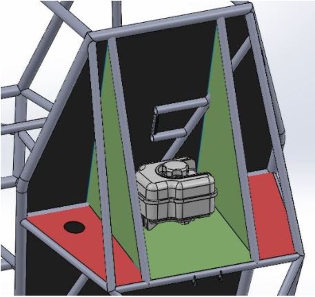Esses itens geraram a seguinte dúvida: Ao manter o tanque isolado pelas paredes marcadas com a cor verde nas imagens abaixo (estrutura meramente ilustrativa), entendemos que somente essa área seria considerada splash shield. Na nossa interpretação, as áreas em vermelho não seriam mais consideradas splash shield e, assim, seria aceitável um furo grande para a passagem do snorkel para arrefecimento da CVT.