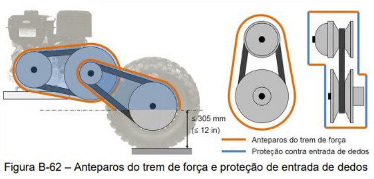 Conforme cita o item B13 os anteparos do trem de força devem proteger todas as peças que girem na velocidade das rodas ou mais rápido, e no item B13.1.3 informa que essas proteções devem se estender ao redor de toda periferia das polias da CVT sendo mais larga do que a mesma, a figura B-62 do regulamento foi anexada para melhor ilustração.