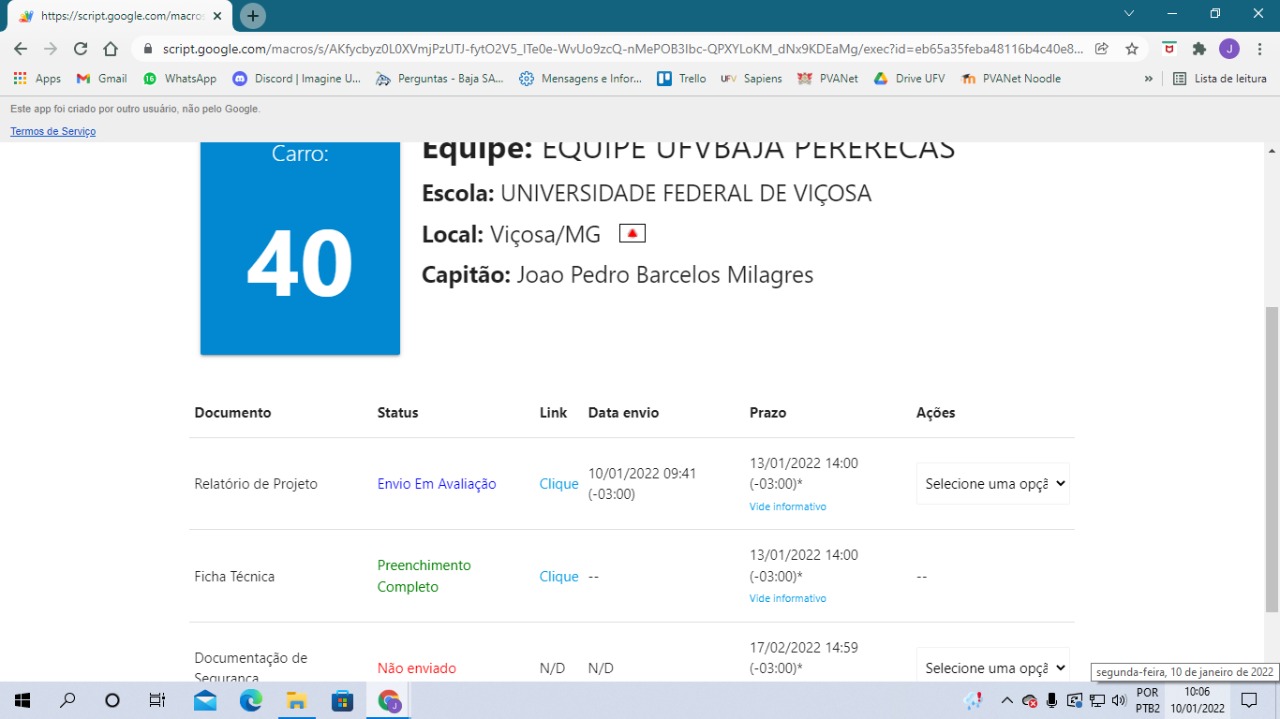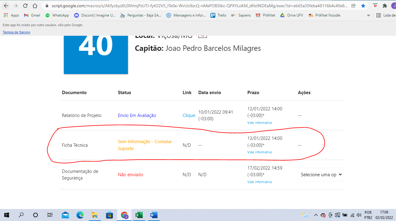 Boa tarde, meu nome é João Pedro, capitão da Equipe UFVbaja Pererecas, da Universidade Federal de Viçosa. Hoje (02/02/2022) entrei no Portal de envio de documentos da 27ª Competição Baja SAE Nacional e a ficha técnica estava com o aviso destacado na primeira imagem em anexo.