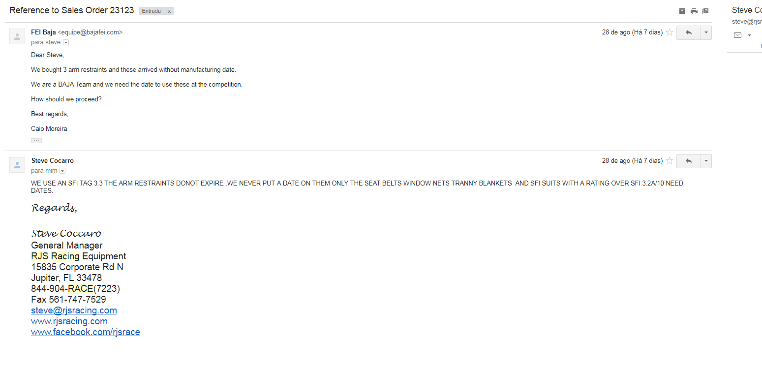 Nesse caso cabe à equipe garantir, no momento da compra, que os equipamentos de segurança do piloto cumpram com todos os requisitos. O Comitê sugere que a equipe entre em contato com a SFI para verificar se essa empresa é de fato certificada e se cumpre com todos os requisitos do último nível da norma SFI 3.3, datada de 26 de Agosto de 2016, inclusive com o item 1.6 da norma SFI 3.3.
