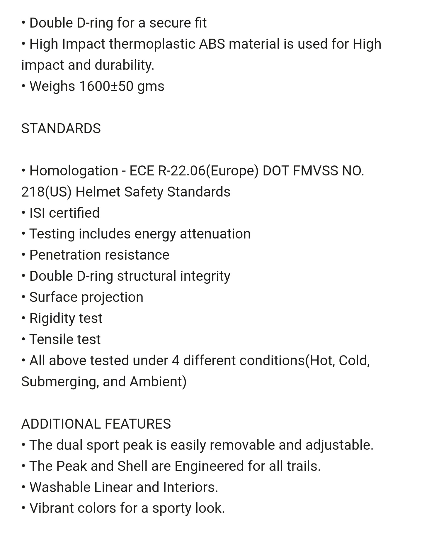 O modelo em questão é do tipo motocross, com proteção integral de queixo e face, e possui homologação ECE R22.06, além de certificações DOT FMVSS No.218 (EUA) e ISI. O capacete também utiliza fechamento em duplo D-ring, conforme exigido para uso esportivo.