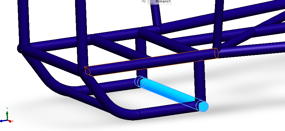 Com isso, surgiu uma dúvida, no nosso projeto para o novo protótipo, o ponto de ancoragem traseiro dos braços inferiores da suspensão dianteira não ficam localizados no LFS, e sim em um tubo paralelo a ele, que também atende as dimensões de membros primários da estrutra, que serve como proteção para o diferencial, uma vez que este foi posicionado abaixo do assoalho. Portanto, como solução, foi adicionado um tubo transversal, paralelo e abaixo do ILC original, destacado na imagem abaixo: