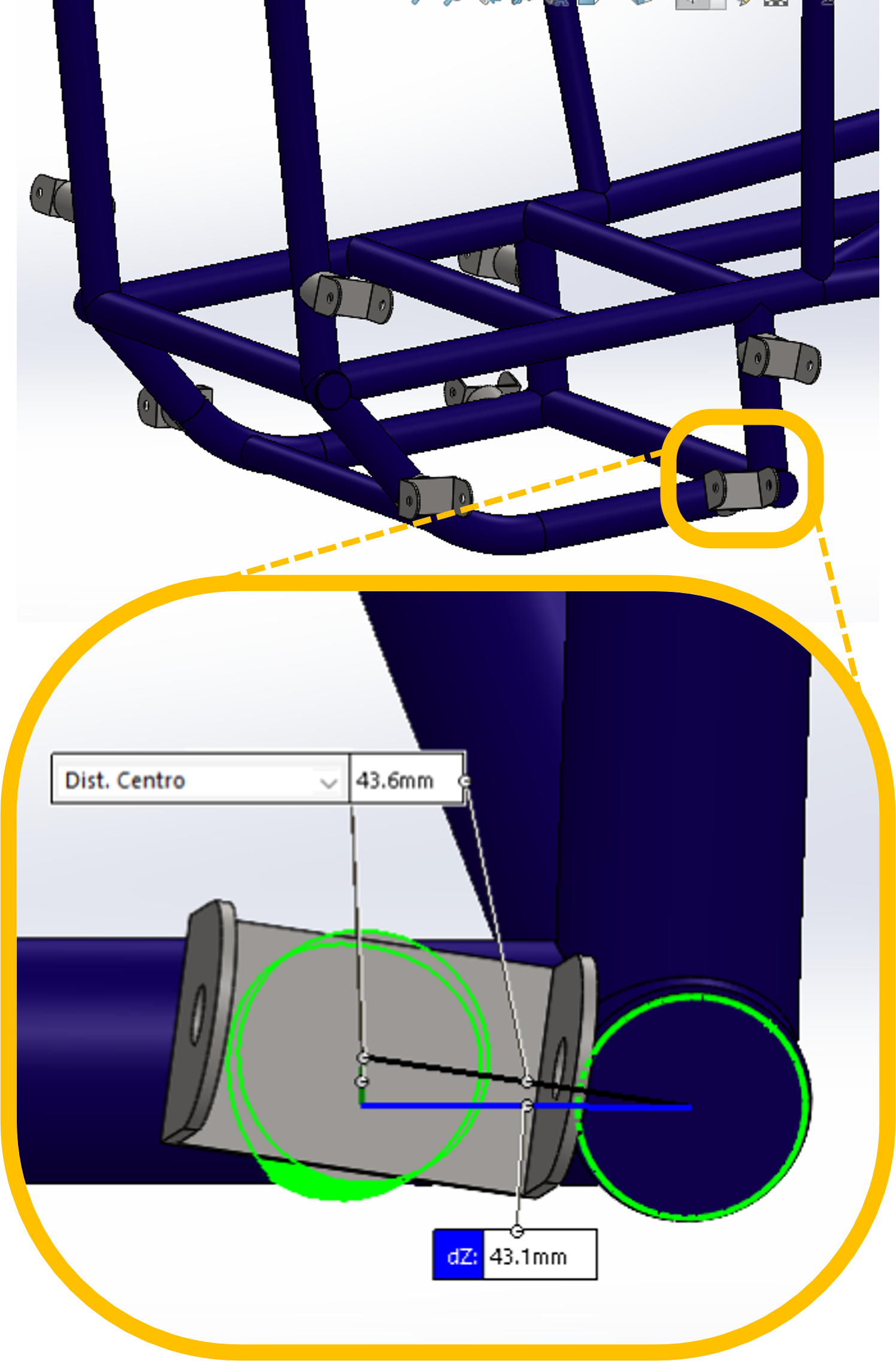 Dessa forma, a distância centro a centro do ponto de ancoragem traseiro dos braços inferiores da suspensão dianteira ao tubo equivalente ao ILC está conforme a seção do regulamento citada acima. Valido ressaltar que ambos os tubos são feitos de aço 1020 e tem as dimensões de 31,75 x 2,00 mm. A distancia entre os tubos está demonstrada na imagem abaixo, sendo esta de 43,1 mm: